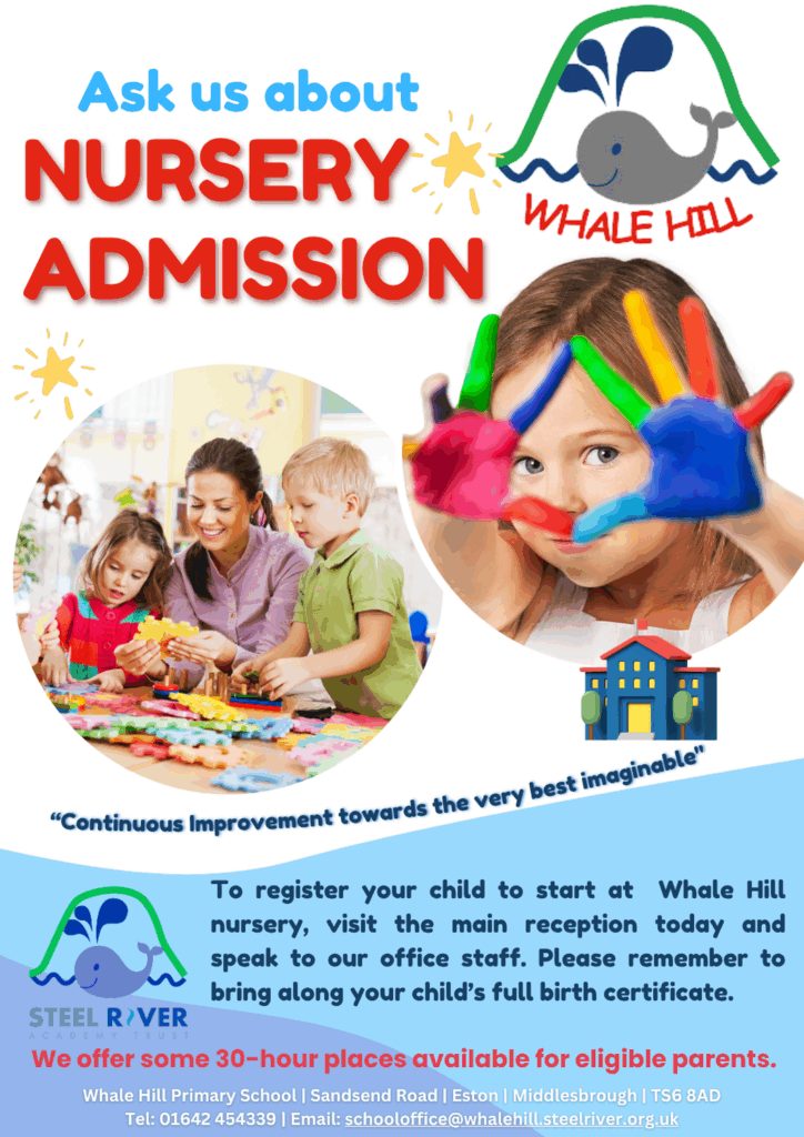 To register your child to start at nursery Whale Hill, visit the main office today and speak to Miss McGee. Please remember to bring along your child’s full birth certificate.
