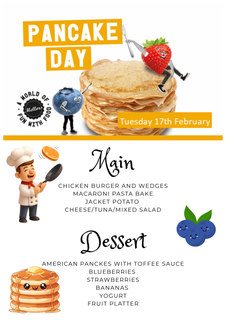 February 17th is Pancake Day, and we will be serving up American Pancakes with fruit and toffee sauce.